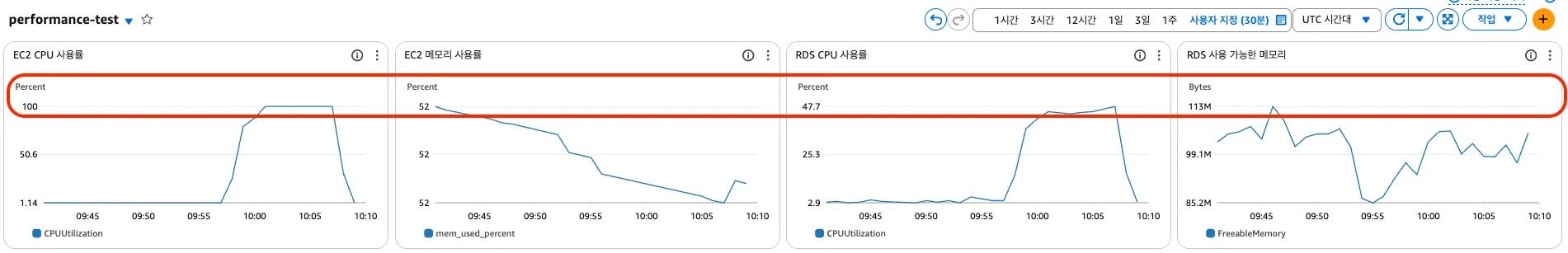 EC2 CPU 사용률을 제외한 나머지 수치가 한계점에 도달하지 않은걸로 보았을 때,
