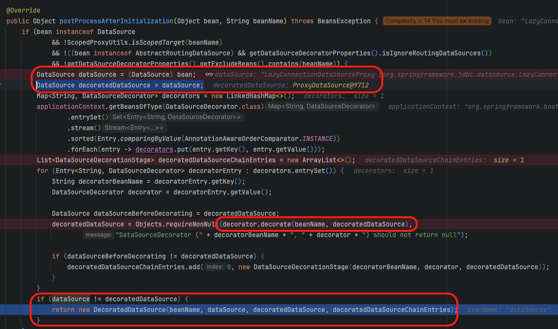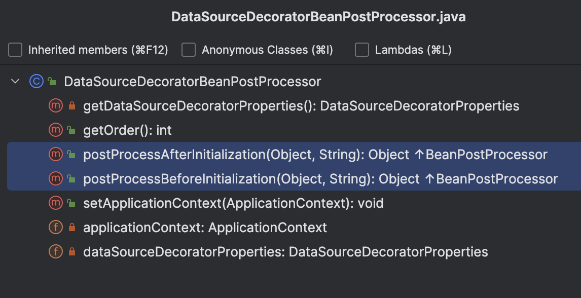 설정 파일에서 DataSourceDecoratorBeanPostProcessor를 빈으로 등록하고 있었고, 해당 클래스는 BeanPostProcessor, Ordered, ApplicationContextAware 인터페이스를 상속받아 구현하고 있었습니다.