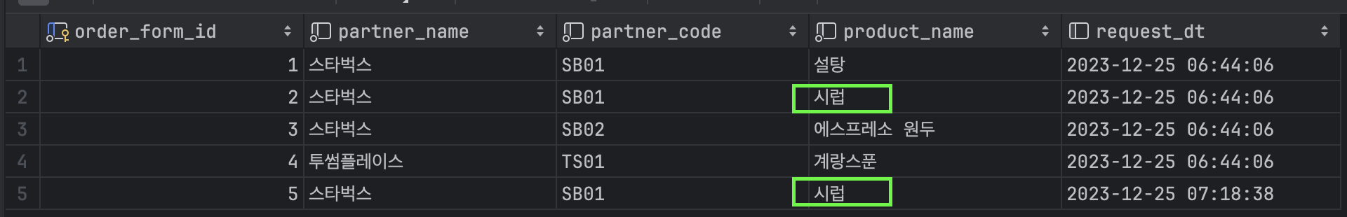 INSERT INTO order_form (partner_name, partner_code, product_name) VALUES ('스타벅스', 'SB01', '설탕');