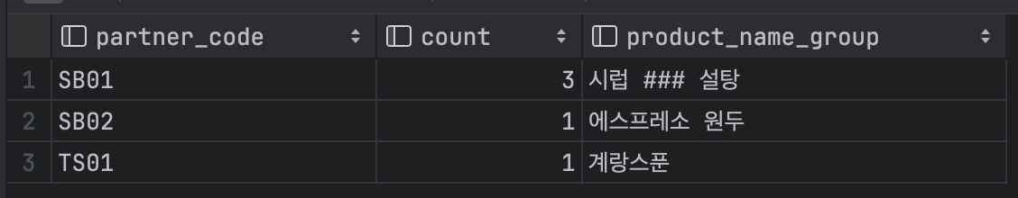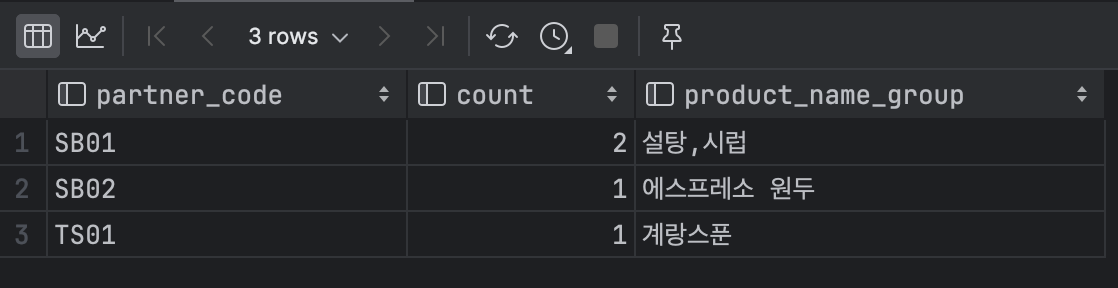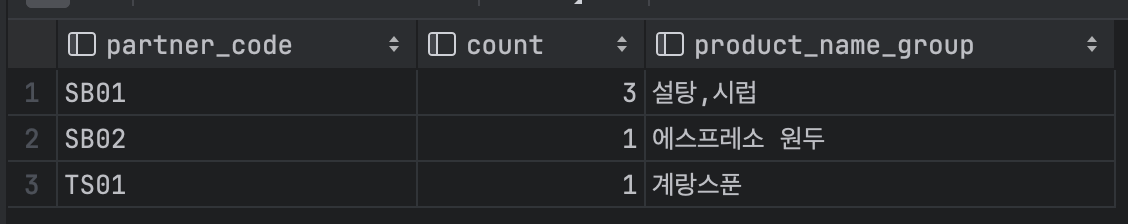이처럼 각 가맹점마다 요청한 상품 목록을 함께 보여주어야 할 때 사용하기 유용한 GROUP_CONCAT 함수가 있습니다.